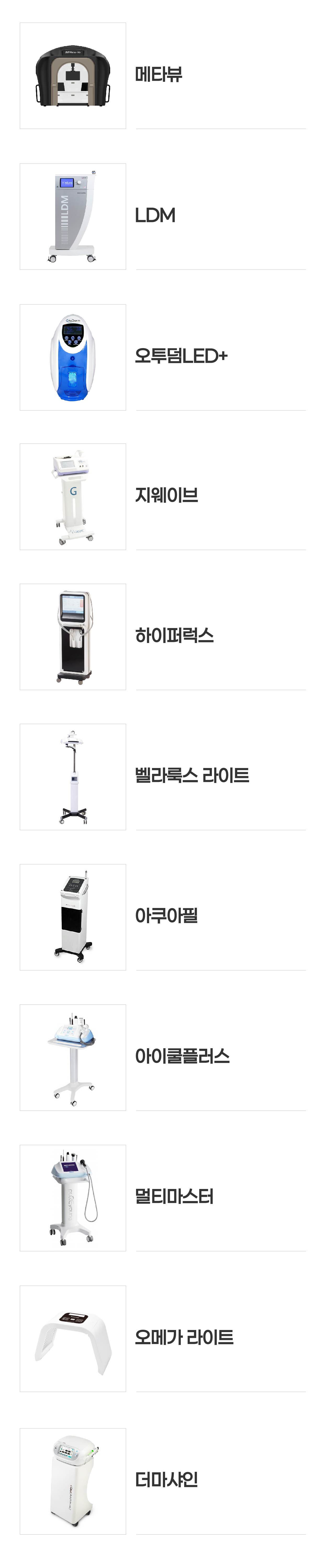 아쿠아필, 아이쿨플러스, 지웨이브, 벨라룩스 라이트, 메타뷰, 오투덤LDE+, LDM, 하이퍼럭스, 더마샤인, 멀티마스터, 오메가 라이트